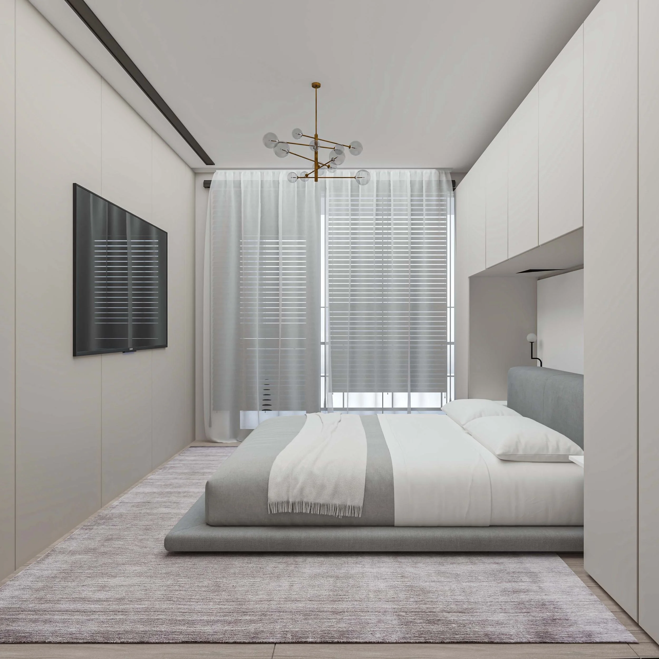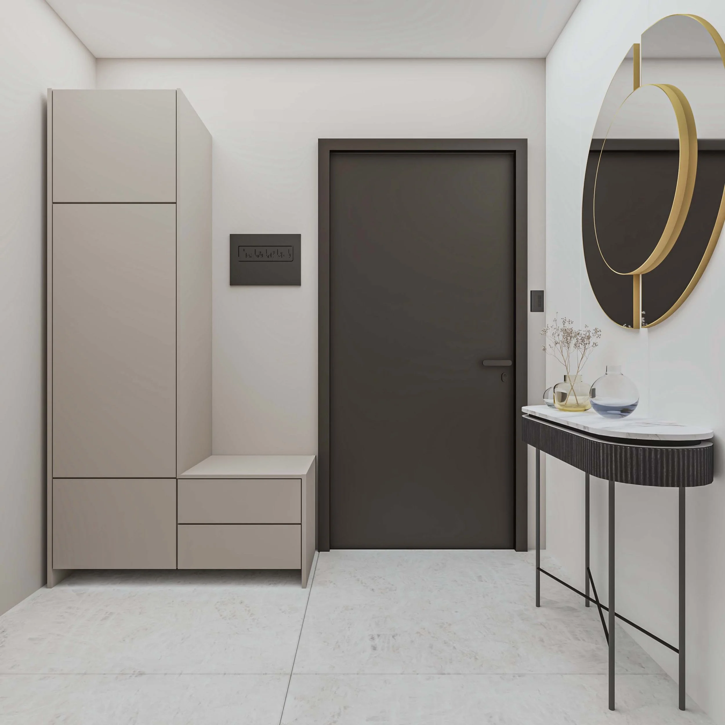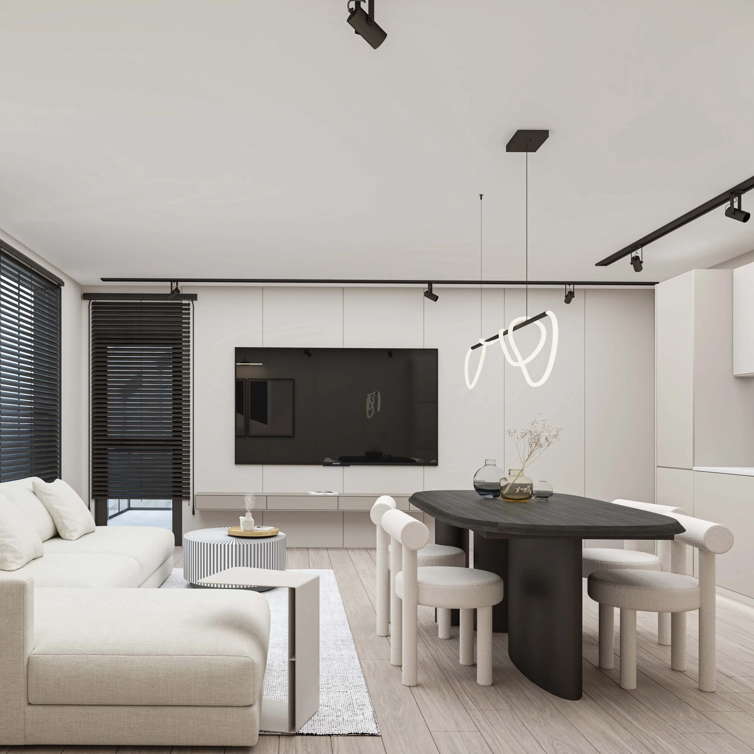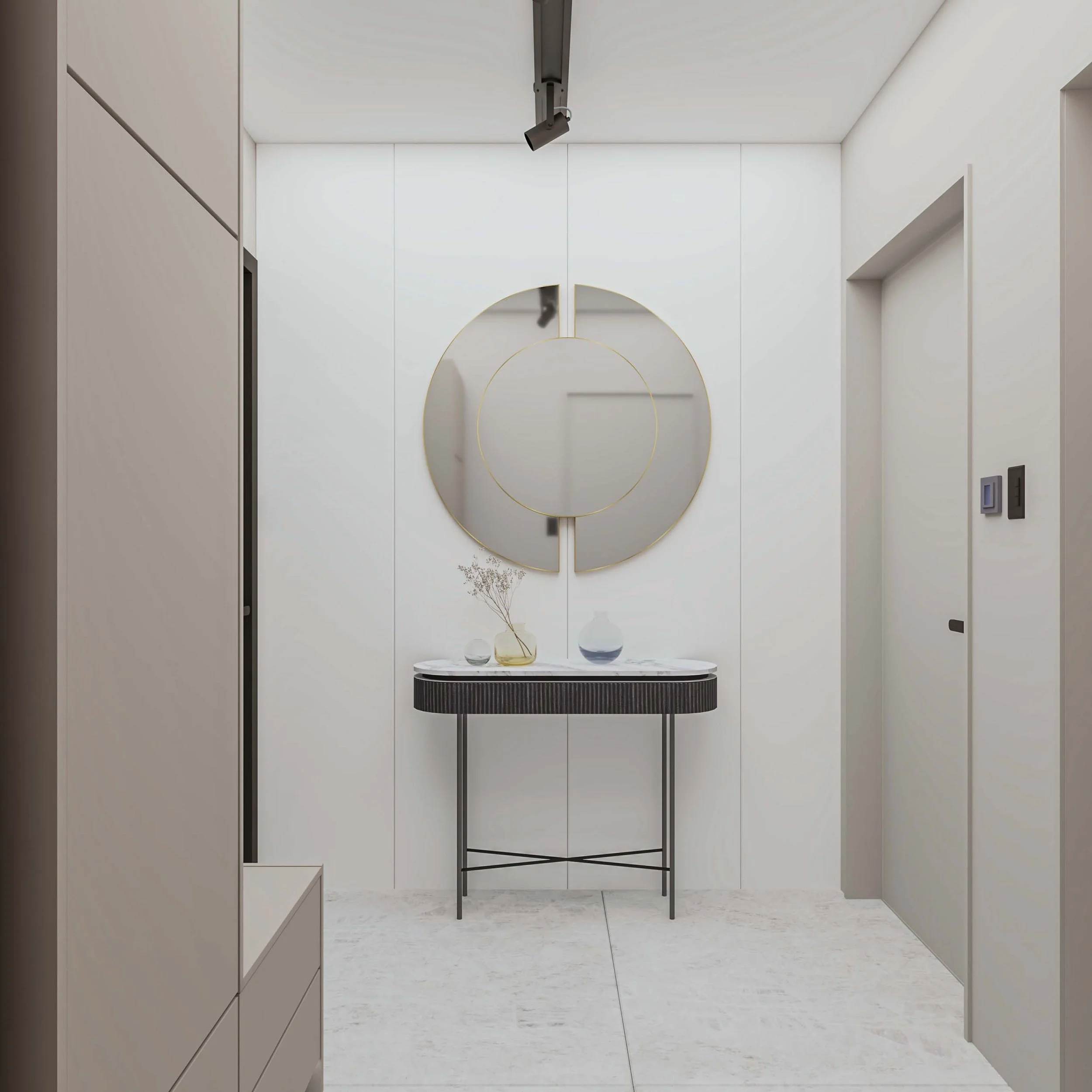 Проектът за този двустаен апартамент в Пловдив съчетава изчистени линии и минималистичен дизайн, който подчертава индивидуалността на пространството. С неутрална цветова схема, състояща се от меки тонове на бяло и таупе, апартаментът създава усещане за спокойствие и хармония. Оптимизацията на пространството е постигната чрез функционални мебели и внимателно разположение на елементите, които позволяват лесно движение и комфорт. Всеки детайл е подбран с мисъл за елегантност, като същевременно се запазва индивидуалният почерк на интериора.